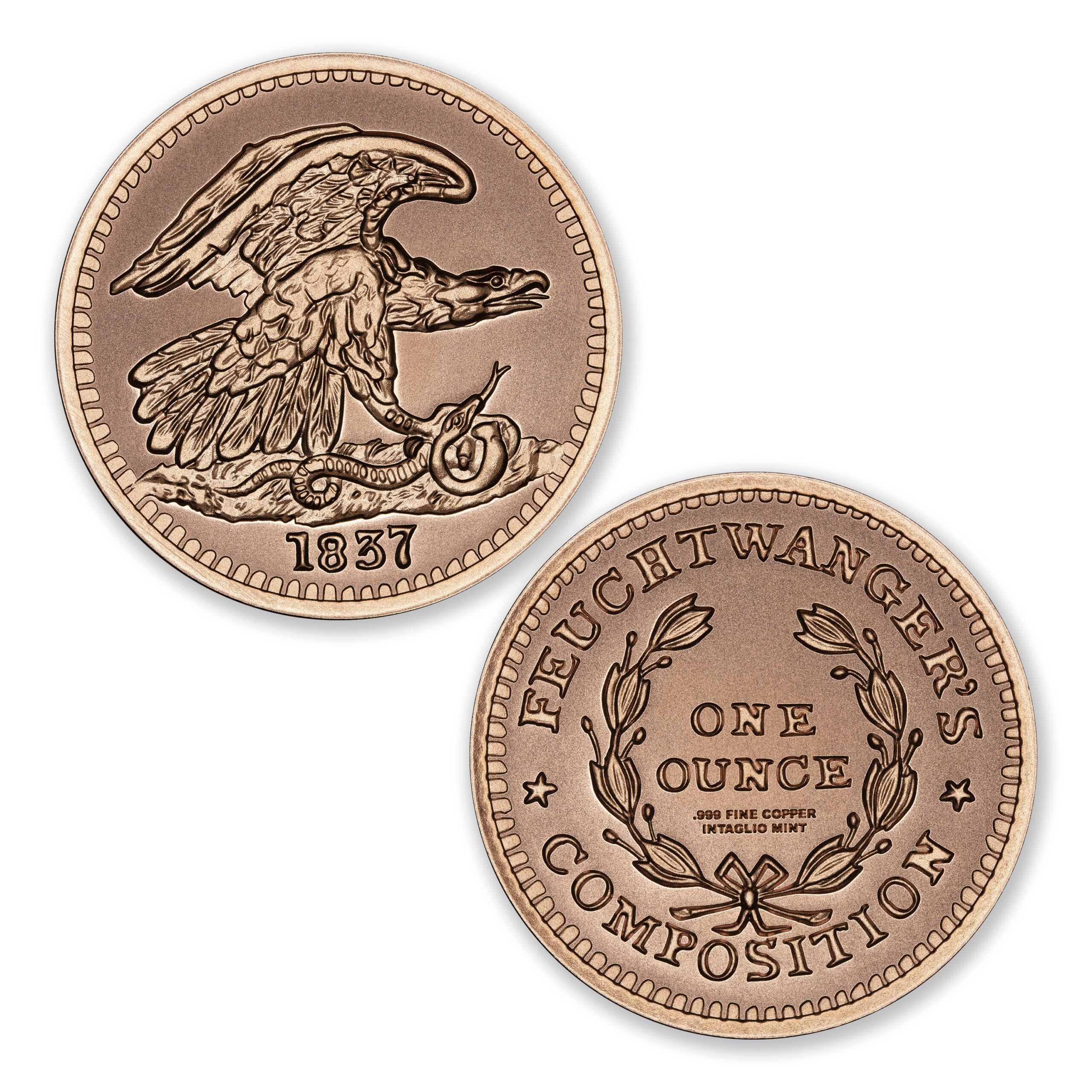 The reverse showcases a clean and elegant composition bearing the inscription “FEUCHTWANGER’S COMPOSITION” surrounding a laurel wreath, with “ONE OUNCE .999 FINE COPPER” at the center. This design pays homage to Feuchtwanger’s original intent—introducing a new coinage metal known as “German silver,” an alloy of copper, nickel, and zinc proposed as a cost-effective alternative to traditional precious metal coinage.